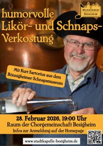 Nachdem unsere Weinprobe im vergangenen Jahr so gut ankam, haben wir uns dieses Mal für eine Schnaps- und Likörprobe entschieden. So laden wir herzlich zur humorvollen Likör- und Schnapsverkostung am Samstag, 28. Februar 2026, in die Räume der Chorgemeinschaft in der Alten Kelter Besigheim ein. Zuerst wird die Mitgliederversammlung abgehalten und danach genießen wir gegen 19 Uhr den Abend in geselliger Runde mit der Verkostung.
